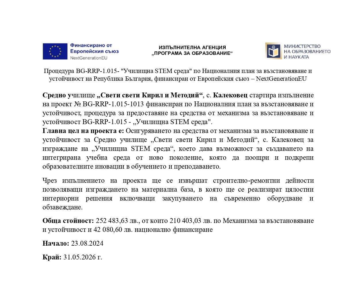 УВАЖАЕМИ РОДИТЕЛИ И УЧЕНИЦИ, ВЪВ ВРЪЗКА С НАЛОЖЕНОТО ИЗВЪНРЕДНО ПОЛОЖЕНИЕ В СТРАНАТА ДО 29.03.2020 Г., су "СВЕТИ СВЕТИ КИРИЛ И МЕТОДИЙ", СЕЛО КАЛЕКОВЕЦ ВЪВЕЖДА ОБУЧЕНИЕ ОТ РАЗСТОЯНИЕ, СЧИТАНО ОТ 16.03.2020 Г. /ПОНЕДЕЛНИК/. УЧЕБНИЯТ ПОЦЕС ЩЕ СЕ ПРОВЕЖДА ПРИ СПАЗВАНЕ НА СЪЩЕСТВУВАЩОТО СЕДМИЧНО РАЗПИСАНИЕ И ПРИЛОЖЕНИЯ ДНЕВЕН РЕЖИМ. УЧИТЕЛИТЕ ЩЕ ИЗПОЛЗВАТ РАЗЛИЧНИ ОНЛАЙН ИНСТРУМЕНТИ, ЕЛЕКТРОННИЯ ДНЕВНИК НА ИНСТИТУЦИЯТА, ПРИЛОЖЕНИЯТА ЗА ОНЛАЙН КОМУНИКАЦИЯ, ОНЛАЙН И ОФЛАЙН ЕЛЕКТРОННИ УЧЕБНИЦИ И ОБРАЗОВАТЕЛНИ РЕСУРСИ. ЗА СЪЩИЯ ПЕРИОД /ОТ 16.03.2020 Г. ДО 29.03.2020 Г./ ДЕЦАТА ОТ ПОДГОТВИТЕЛНА ГРУПА НЯМА ДА ПОСЕЩАВАТ УЧИЛИЩЕ/.